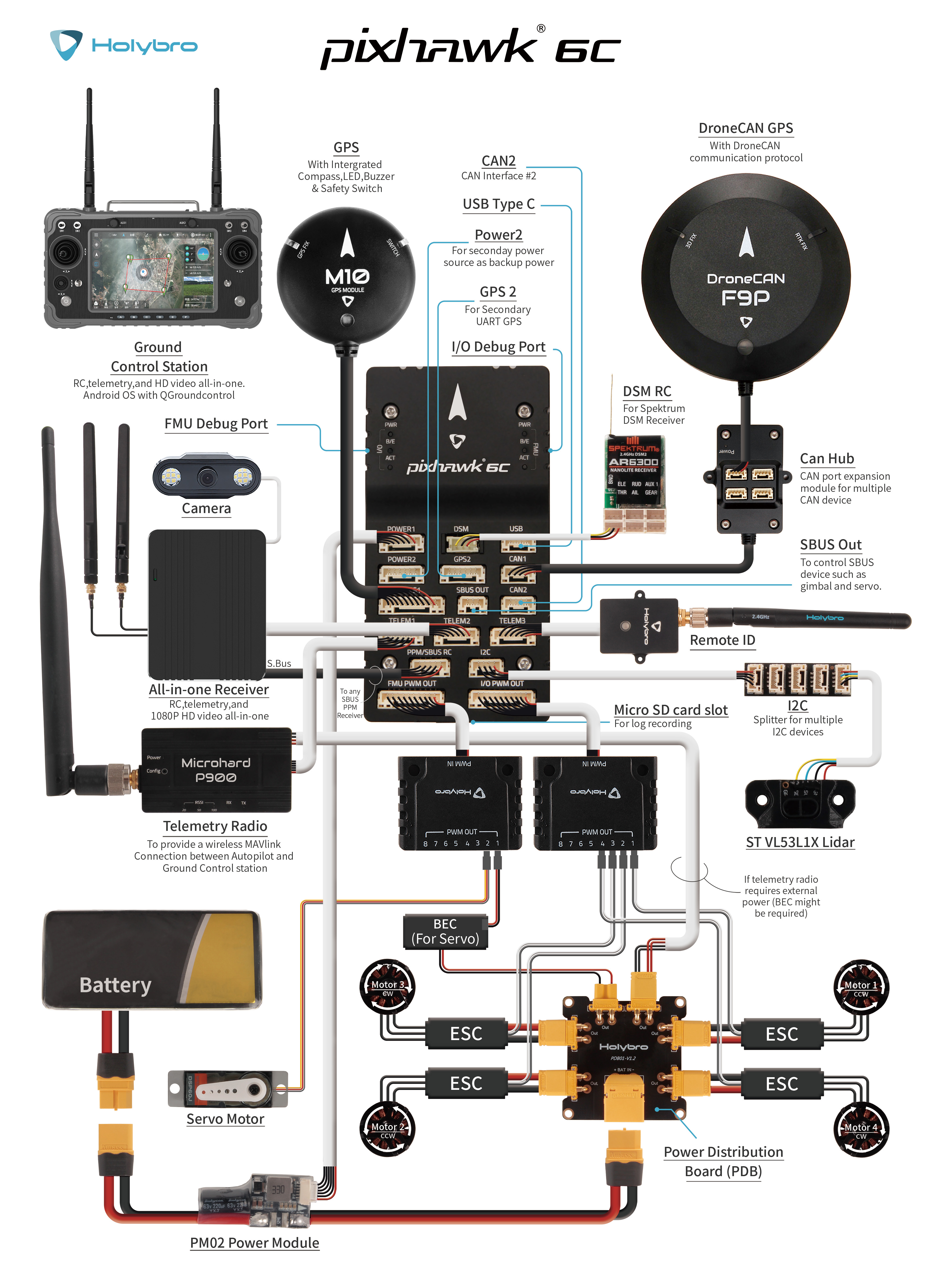 <figure><img src="https://2367252986-files.gitbook.io/~/files/v0/b/gitbook-x-prod.appspot.com/o/spaces%2FLIgtGDAvVGkCKGOJb1bR%2Fuploads%2FvBXchgRXzI4MMvoSBEbP%2FPixhawk6C%20Sample%20Wiring%20Diagram.jpg?alt=media&#x26;token=067243d5-7a9e-4fbb-a569-56fd543f3f1e" alt=""><figcaption></figcaption></figure>
